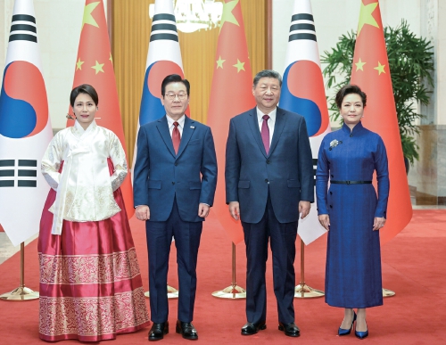 1月5日下午,国家主席习近平在北京人民大会堂同来华进行国事访问的韩国总统李在明举行会谈。这是会谈前,习近平和夫人彭丽媛同李在明和夫人金惠景合影。 新华社发