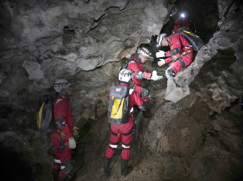 2025年12月,航天员在洞穴中进行物品传递协作训练。 新华社发